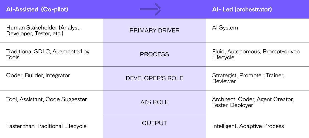 The visual below illustrates the current state of the AI-assisted SDLC alongside the future state, AI-led IDLC model: