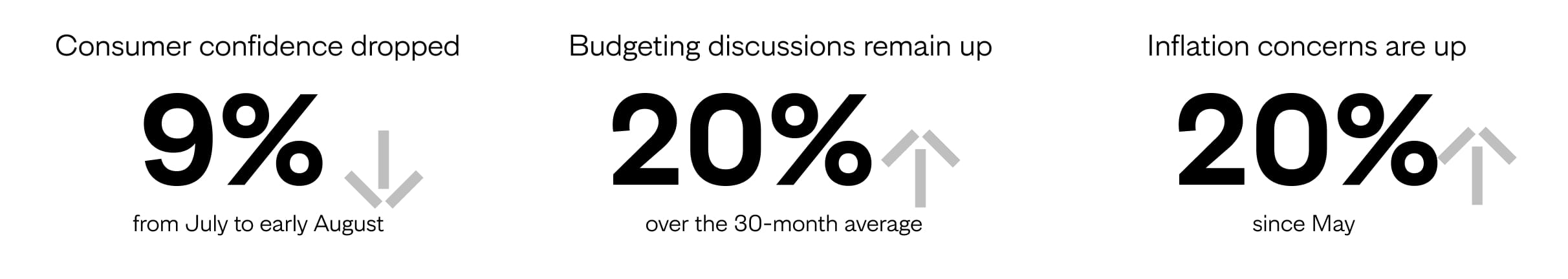 Material’s own research shows that U.S. consumers are still price-wary and dug in. Budgeting talk is persistently high; confidence slipped in early August alongside a jump in tariff and uncertainty chatter; inflation and job-loss concerns are creeping back in, though outright economic anxiety is not rising.